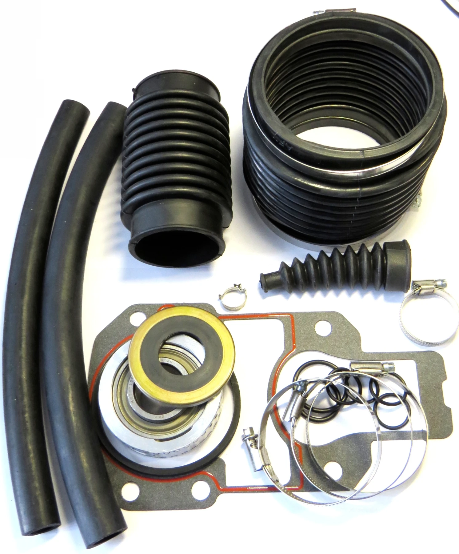Drivknutsbälg, avgasbälg, växelbälg, stödlager, vattenslang, drevmonteringspackning.