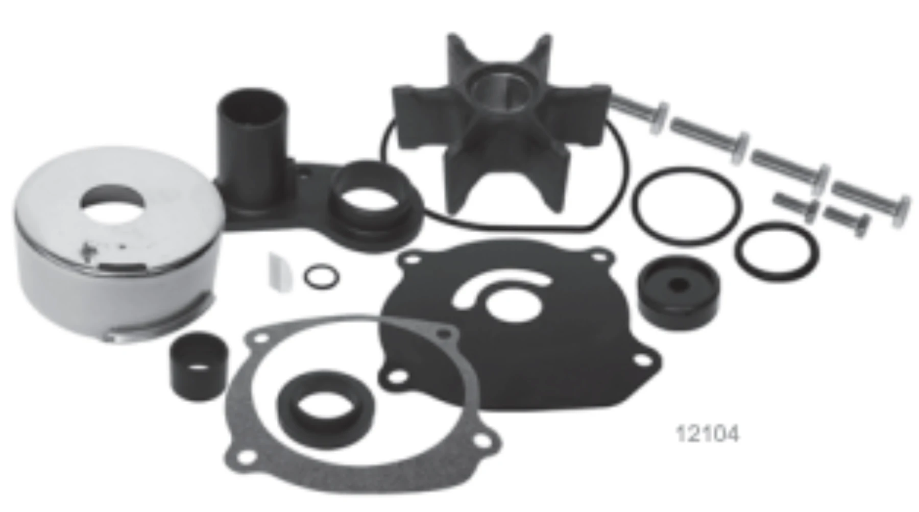 Renoveringssats för vattenpump med packningar, impeller och pumphus.