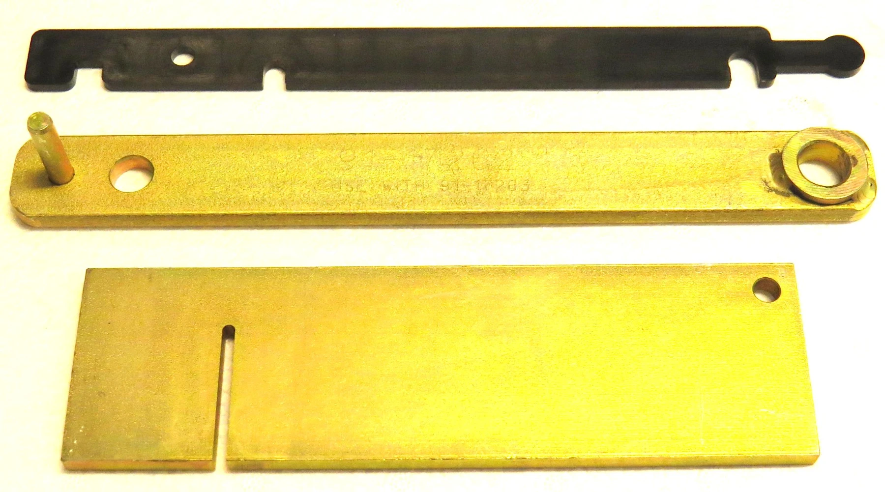 Svarta plastarmen visar slaglängden på växelbryggan från reglaget. Metallarmen visar rätt längd på växelvajeränden inne i båten (den som fortsätter mot drevet). Stora metallplattan läggs an mot bälghuset, och växelvajeränden med knopp träs över spåret i metallplattan och läggs direkt emot.